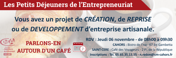 Les Petits Déjeuners de l’Entrepreneuriat sont organisés par la Chambre de Métiers et de l’Artisanat du Lot ; un moment convivial et d’échanges avec des professionnels pour vous aider à concrétiser votre projet dans l’artisanat (financements, formation…). L’occasion également d’élargir votre cercle de contacts.