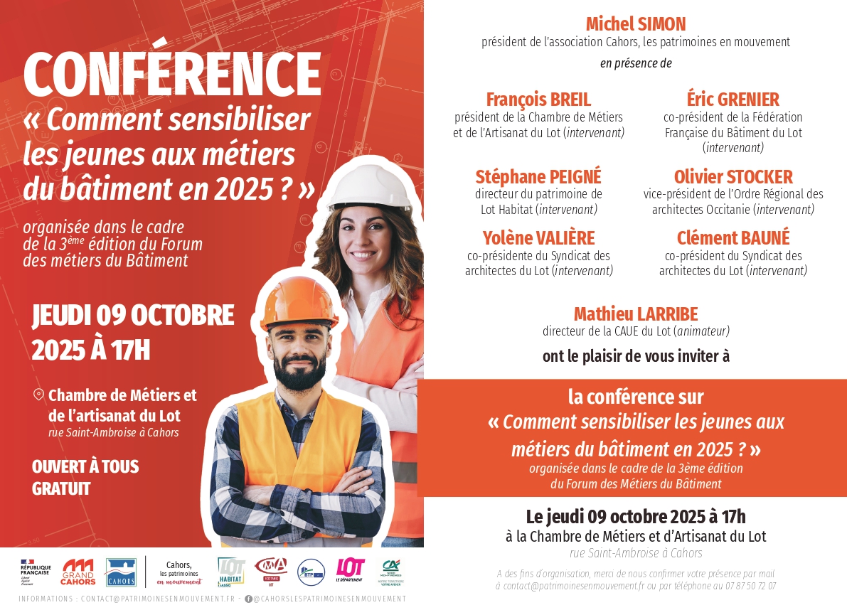 Dans le cadre de la 3ème édition du Forum des métiers du Bâtiment, se déroule jeudi 09 octobre à 17h à la Chambre de Métiers et de l’artisanat du Lot – 235, rue Saint-Ambroise à Cahors, une conférence sur le thème “« Comment sensibiliser les jeunes aux métiers du bâtiment en 2025»
