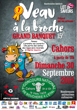 La Maison de l’Artisan du Lot en partenariat avec le syndicat des Bouchers du Lot, la Confédération Générale de l’Alimentation de Détail du Lot (CGAD 46), et la Chambre de Métiers et de l’Artisanat du Lot organise pour la première fois dans la ville de Cahors sur les allées Fénelon, le 30 septembre 2018, un grand banquet festif sur le thème du « Veau à la Broche.»