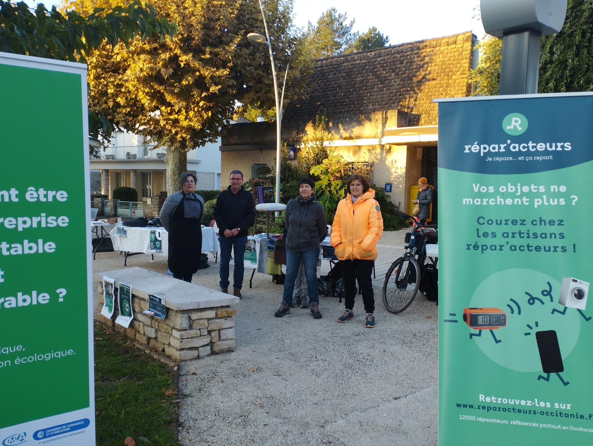 Le 17 octobre 2025 : dans le cadre des Journées Nationales de la Réparation, 4 artisans labellisés “Répar’acteurs” – acteurs de la réparation étaient présents sur le marché de PRAYSSAC, où ils ont assuré des démonstrations et présenté leurs activités :Qui sont-ils ?– Sylvie SAUER, Matelasserie de la Thèze -Tapisserie d’ameublement, Matelasserie à Montcabrier– Monique BAFFALIE, La Sellerie Douellaise– Sellière/garnisseuse, Reparation sellerie cuir auto/moto à Douelle– François LEROYER, François.Leroyer.Créations, Réparation de Meubles à Sauzet– Béatrice & Thierry MANIER, La bicyclette prayssacoise, Réparation,Vente,Location de tous types de vélos à PrayssacÉvènement organisé par la Chambre de Métiers et de l’Artisanat du Lot dans le cadre de la convention de partenariat avec la Communauté de Communes de la Vallée du Lot et du Vignoble.Intéressé-e par le dispositif REPAR’ACTEURS : contactez la #CMA46 – Fabrice MERGEL – Chargé de mission Environnement-Sécurité-Hygiène – Tél. 05.65.35.13.55 – f.mergel@cm-cahors.fr